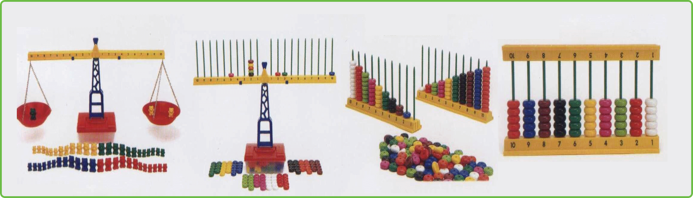 串棒20支10色,算盤珠100粒,4色砝碼比例熊48支,橫臂2支,
