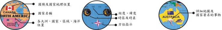 圖案生動活潑,易於激發兒童學習英語的興趣並可認識全世界國家地理位置、國旗及各地時區 |