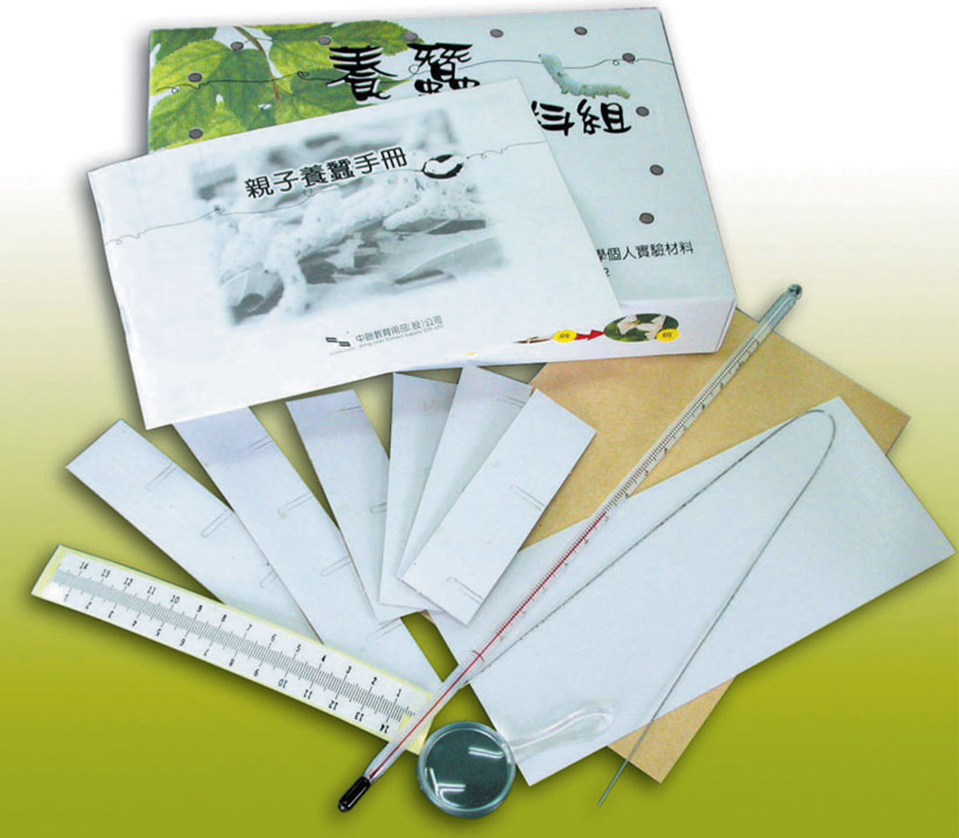 養蠶盒/放大鏡/隔板(繭室)/蠶絲長度計算卡/產卵紙/溫度計/尺標貼紙/親子手冊