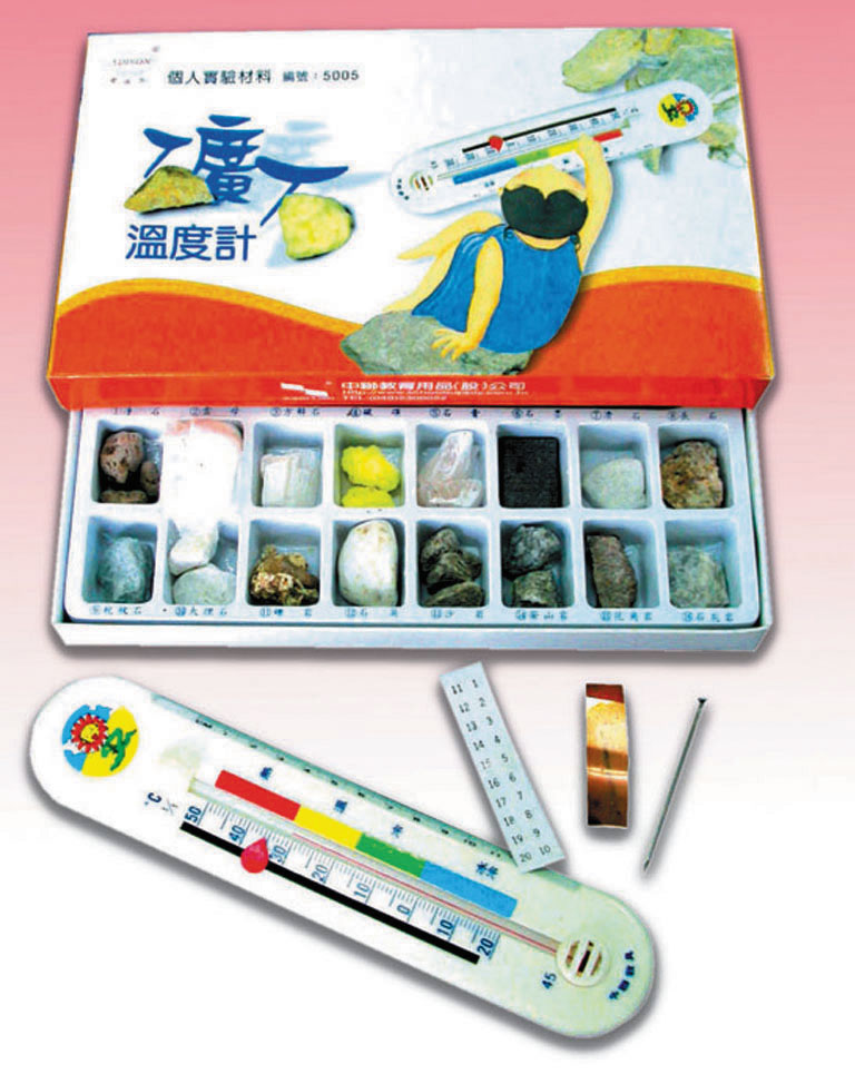 礦石16種,溫度50℃溫度計、銅片、釘子